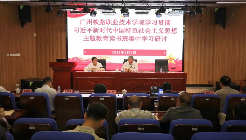 为推动学习贯彻习近平新时代中国特色社会主义思想主题教育理论学习持续走深走实,5月31日至6月2日,广州铁职院在科教城校区召开主题教育读书班集中学习研讨暨党委理论学习中心组(扩大)学习会。学校领导班子成员、全体中层干部参加读书班集中学习研讨,邀请市委主题教育第八巡回指导组组长沈莹同志、组员徐爱文同志到会指导。