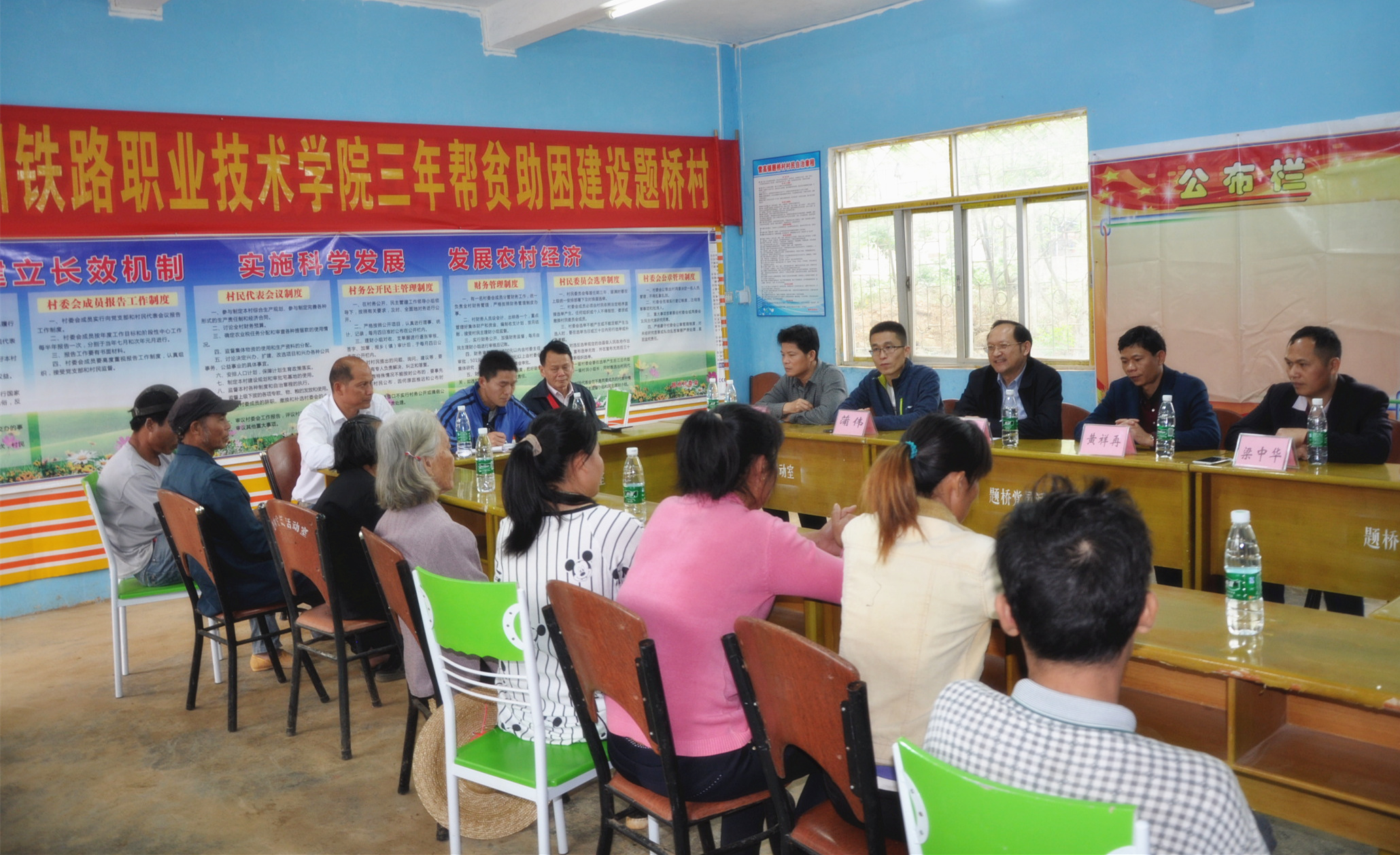 广州铁职院党委高度重视扶贫开发“双到”工作,在克服学院经费紧张情况下足额安排了扶贫资金。据统计,学院为题桥村多渠道、多方式筹措资金共计1500余万元,为圆满完成扶贫开发“双到”工作任务,提供了经费保障。三年来,学院帮扶题桥村实现了村集体经济“造血功能”建设预期,村集体经济年收入由0.5万元提高到7.5万元;解决了村民出行问题,完成入村公路、村巷道硬底化工程8.5公里;解决了全村近3000人饮水安全问题,完成安全自来水系统设施修建;解决了农田灌溉问题,完成农田灌溉水渠建设17公里;解决了贫困人口基础保障问题,做到了“低保户”、“五保户”、贫困人口城乡居民养老保险和城乡居民基本医疗保险全覆盖;解决了贫困户子女入学难问题,贫困户适龄子女“普九”入学率达到100%,考上大、中专学校的贫困户子女零因贫辍学。
